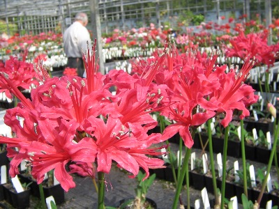 Nursery owner, Ken Hall, in discussion with members about his Nerine Sarniensis blooms.